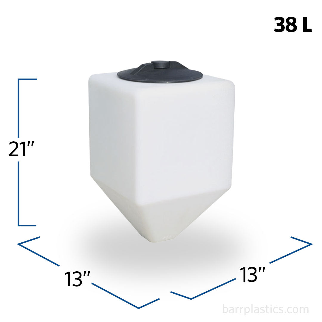 The 10 Gallon Square Plastic Cone Bottom Specialty Rinse Tank is a compact and efficient tank designed for small rinse, mixing, or supply applications. Its square footprint saves space, and the cone bottom shape helps the tank drain out with very little liquid left behind. This makes it a practical choice for sprayers, light-duty chemical handling, and equipment rinse stations.