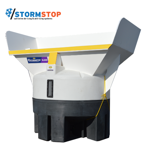 The SBS300 Blend Unit includes a 1550-gallon batch tank and is designed for immediate operation by simply connecting power and water. It features an onboard high-flow transfer pump for loading truck-mounted sprayer units, making it an all-in-one solution for contractors needing to produce and store a 23% salt brine solution ready for use.